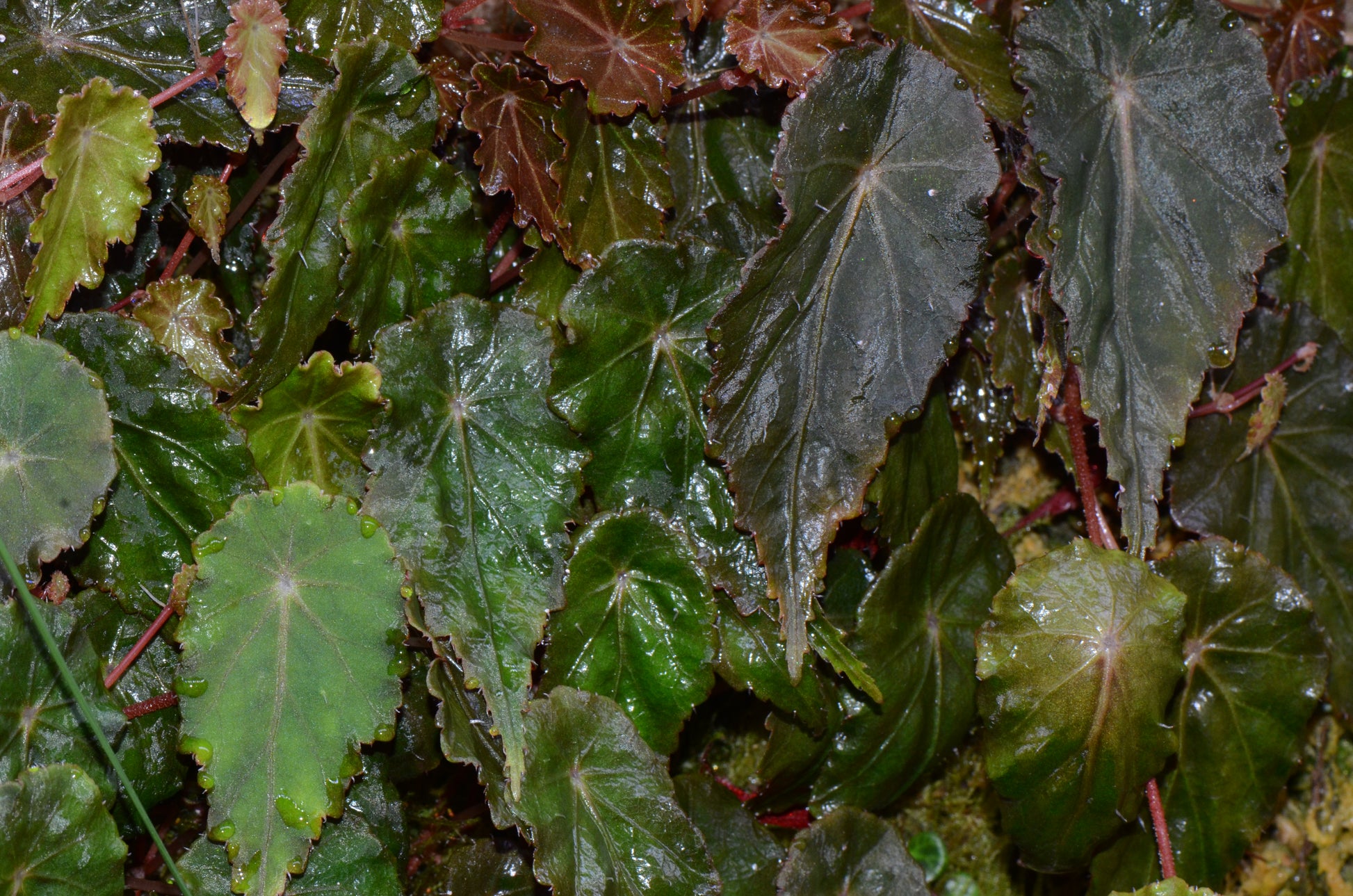 This beautiful Gobenia group begonia hails from the cloudforests of Northern Peru. White spotted foliage is produced only under extremely low light. the second pic shows the vibrant foliage that this plant produces under typical terrarium lighting. Sold as cuttings.