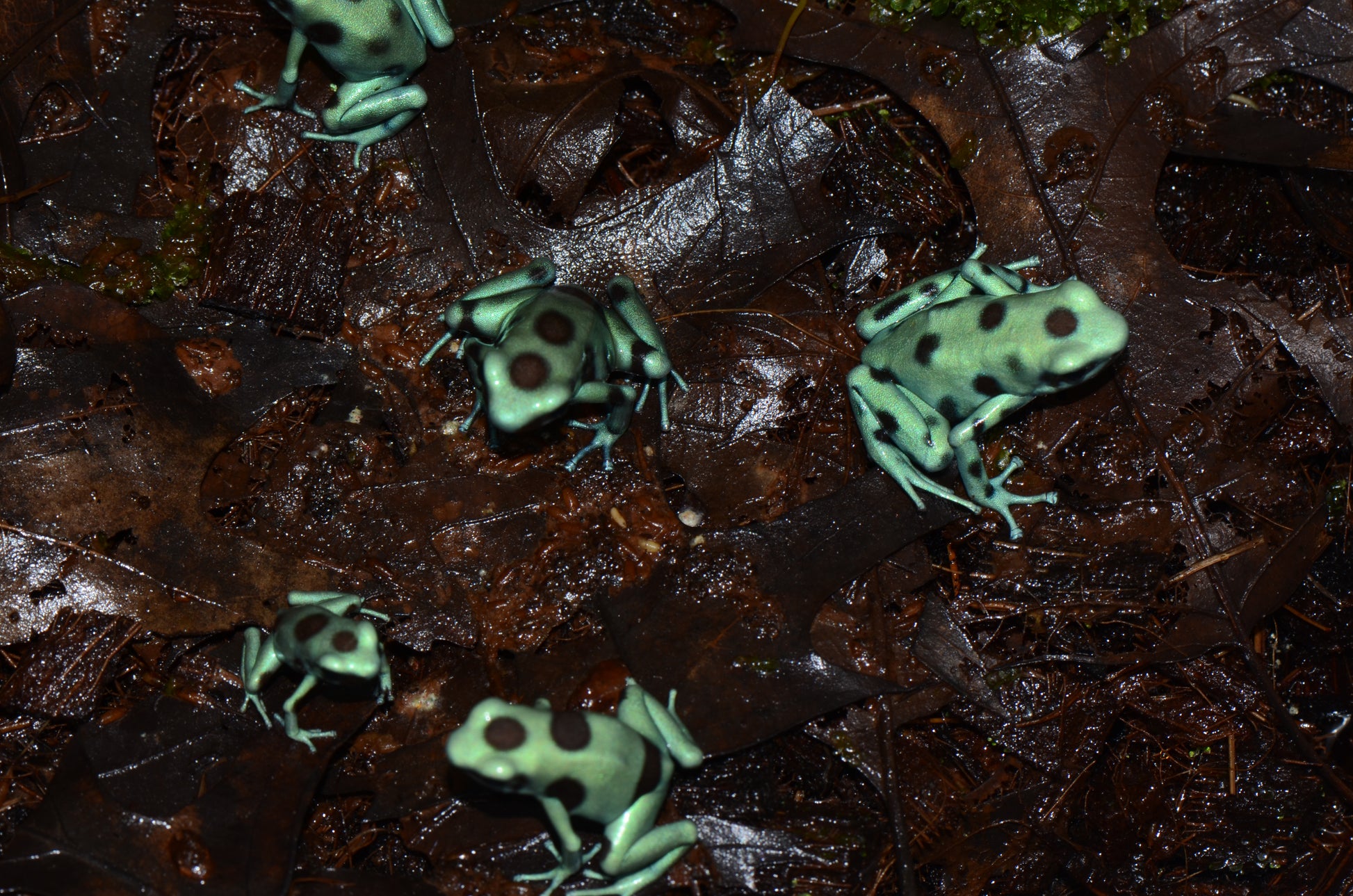 Our stock of these stunning frogs were imported directly by us from Simply Natural Dart frogs in the early 2000's. These stunning green to turqoise green frogs express a widely varying degree of brown/bronze spots. Some have almost no spotting at all.